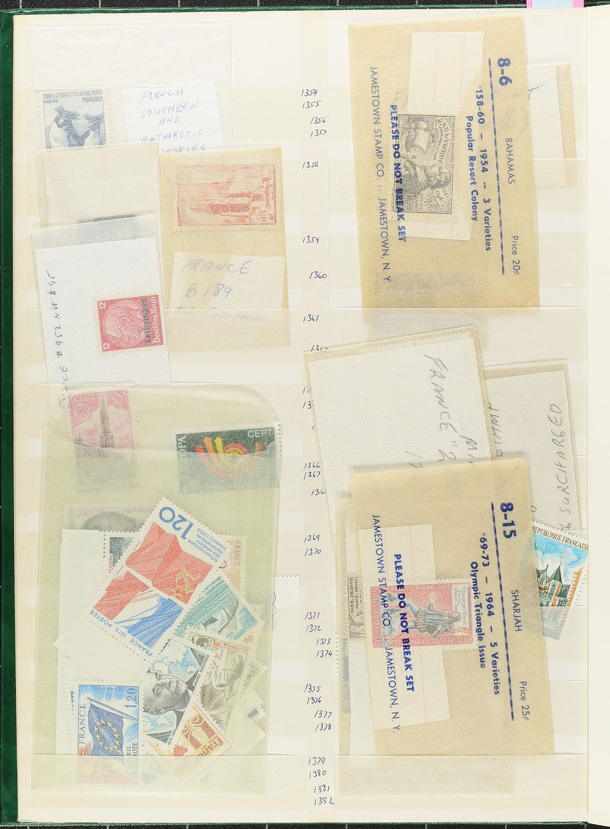 Collection of mint France, 1936-1970, containing roughly 500 different stamps in a fairly well organized stockbook, The collection generally ranges from Scott #311/1279, with some material in beyond the given range, mostly organized by Scott number, with some material still in glassines, or newer purchases misplaced at the front and back of the stockbook. A spot check indicated some singles and sets cataloguing $5 to $15 each, with mostly lightly hinged stamps up to 1960, and mostly never hinged stamps thereafter. A nice stater collection of this popular country. Estimate =