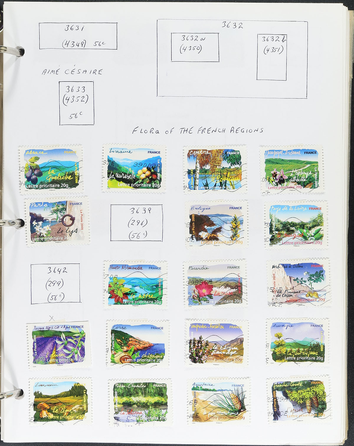 Collection of primarily used France and French Colonies, 1853-2011, containing a few thousand stamps on over 100 well organized homemade pages housed in two binders. The lot is essentially in two halves, the first being a used collection of France, ranging from Scott #14/4025, with better representation up to the 1970's, along with selections of precancels, perfins, and back of the book issues, and the second part having mint and used stamps from French colonies with better representation from Reunion, French Morocco, etc. A spot check indicated stamps and sets cataloguing in the $5 to $10 range. A nice lot from this popular collecting country. Estimate =