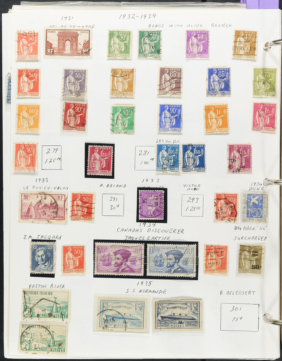 Collection of primarily used France and French Colonies, 1853-2011, containing a few thousand stamps on over 100 well organized homemade pages housed in two binders. The lot is essentially in two halves, the first being a used collection of France, ranging from Scott #14/4025, with better representation up to the 1970's, along with selections of precancels, perfins, and back of the book issues, and the second part having mint and used stamps from French colonies with better representation from Reunion, French Morocco, etc. A spot check indicated stamps and sets cataloguing in the $5 to $10 range. A nice lot from this popular collecting country. Estimate =
