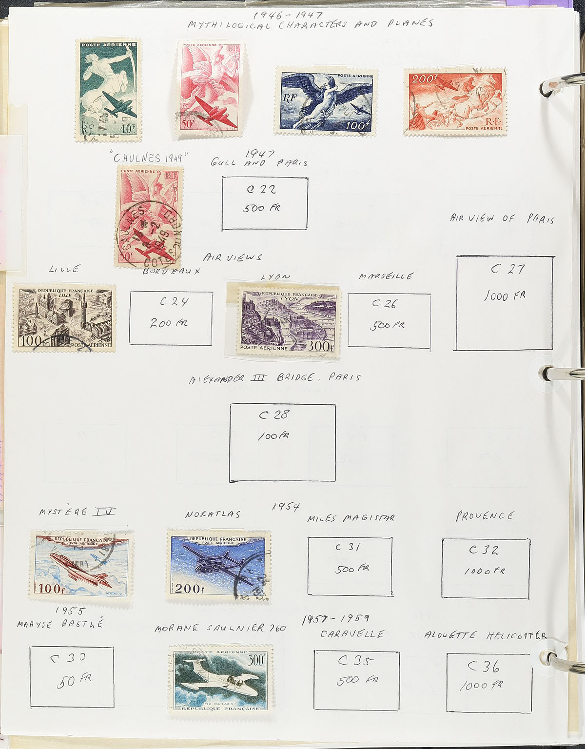 Collection of primarily used France and French Colonies, 1853-2011, containing a few thousand stamps on over 100 well organized homemade pages housed in two binders. The lot is essentially in two halves, the first being a used collection of France, ranging from Scott #14/4025, with better representation up to the 1970's, along with selections of precancels, perfins, and back of the book issues, and the second part having mint and used stamps from French colonies with better representation from Reunion, French Morocco, etc. A spot check indicated stamps and sets cataloguing in the $5 to $10 range. A nice lot from this popular collecting country. Estimate =