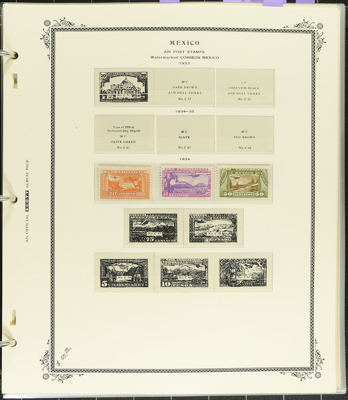 Clean collection of primarily mint Mexico airmail and back of the book issues, 1922-1980, containing over 600 stamps, in a lovely hingeless Scott Specialty Album with slipcase. The strength of the collection is with the airmail issues, containing roughly 475 stamps (and a few souvenir sheets), ranging from Scott #C1/C635, noting singles and sets cataloguing $10 to $50 and up, including C54-C56 (mh, $55 total), C123-C125 (lh, $65 total), to name a few. The balance of the collection contains a few hundred back of the book issues, mostly Officials, Porte De Mar issues, and more. Owner's older Scott catalogue value for the collection totals US$1,857.00 ($2506.95 CDN, almost all pages include pricing by the owner). A collection that begs to be continued in such a lovely album, with online photos showing a sampling. Estimate =