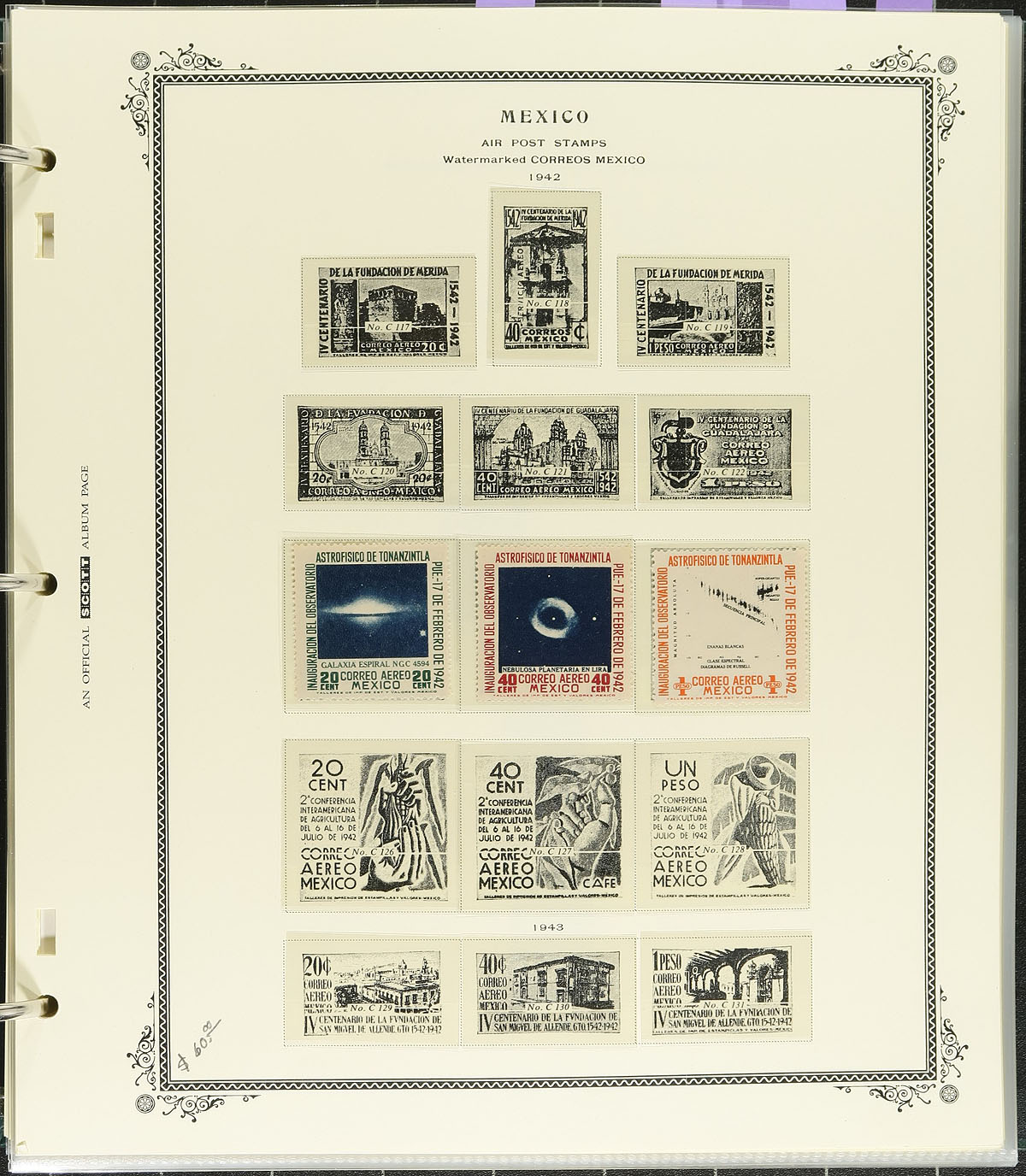 Clean collection of primarily mint Mexico airmail and back of the book issues, 1922-1980, containing over 600 stamps, in a lovely hingeless Scott Specialty Album with slipcase. The strength of the collection is with the airmail issues, containing roughly 475 stamps (and a few souvenir sheets), ranging from Scott #C1/C635, noting singles and sets cataloguing $10 to $50 and up, including C54-C56 (mh, $55 total), C123-C125 (lh, $65 total), to name a few. The balance of the collection contains a few hundred back of the book issues, mostly Officials, Porte De Mar issues, and more. Owner's older Scott catalogue value for the collection totals US$1,857.00 ($2506.95 CDN, almost all pages include pricing by the owner). A collection that begs to be continued in such a lovely album, with online photos showing a sampling. Estimate =