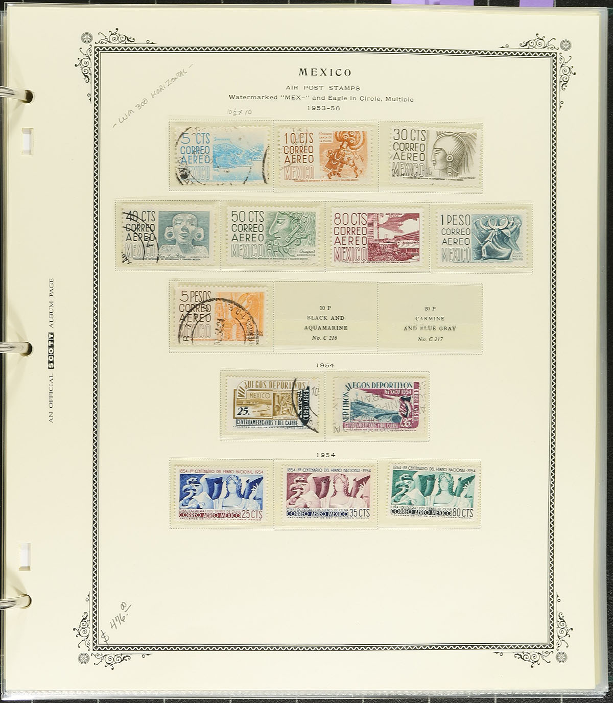 Clean collection of primarily mint Mexico airmail and back of the book issues, 1922-1980, containing over 600 stamps, in a lovely hingeless Scott Specialty Album with slipcase. The strength of the collection is with the airmail issues, containing roughly 475 stamps (and a few souvenir sheets), ranging from Scott #C1/C635, noting singles and sets cataloguing $10 to $50 and up, including C54-C56 (mh, $55 total), C123-C125 (lh, $65 total), to name a few. The balance of the collection contains a few hundred back of the book issues, mostly Officials, Porte De Mar issues, and more. Owner's older Scott catalogue value for the collection totals US$1,857.00 ($2506.95 CDN, almost all pages include pricing by the owner). A collection that begs to be continued in such a lovely album, with online photos showing a sampling. Estimate =