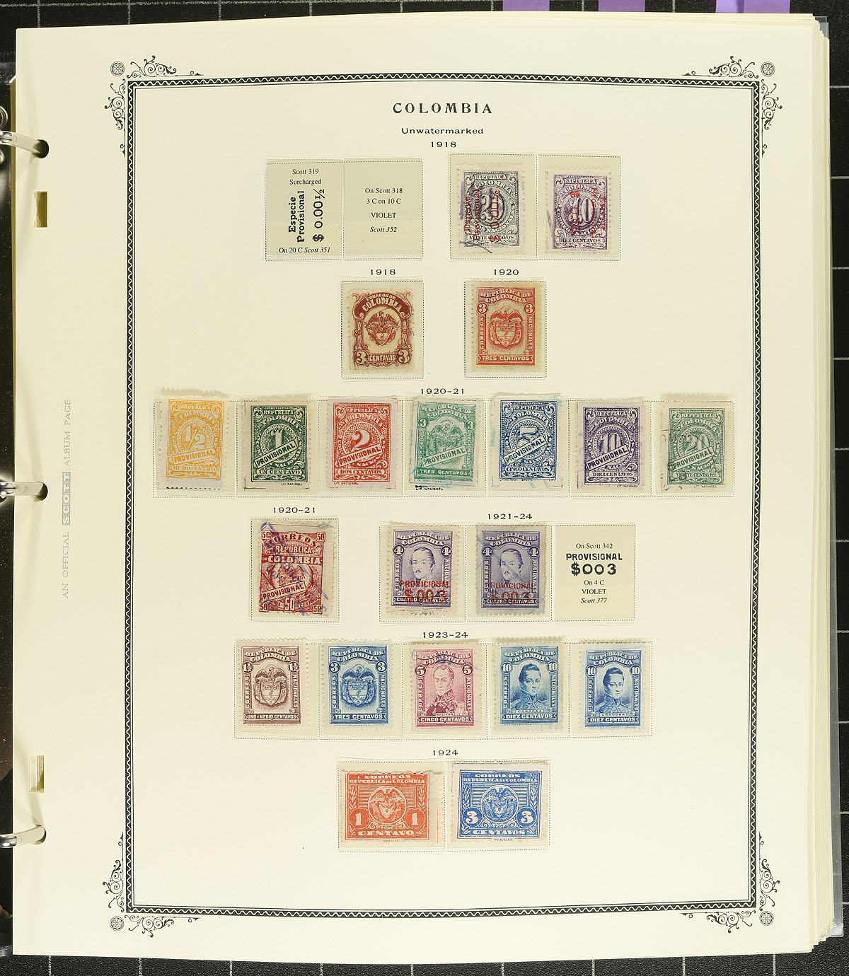 Nice collection of primarily mint Colombia, 1865-1977, containing roughly 1,225 stamps, well organized in several hingeless Scott Specialty album pages housed in a binder. The strength of the collection ranges from the 1880's up to the 1970's, and includes "back of the book" issues noting airmails, Colombia States, and more. A spot check indicated some stamps and sets ranging from $5 to $15 each. Owner's older Scott catalogue value for the collection totals US$1,331.00 ($1796.85 CDN). A nice collection that should be expanded, overall fine to very fine. Estimate =