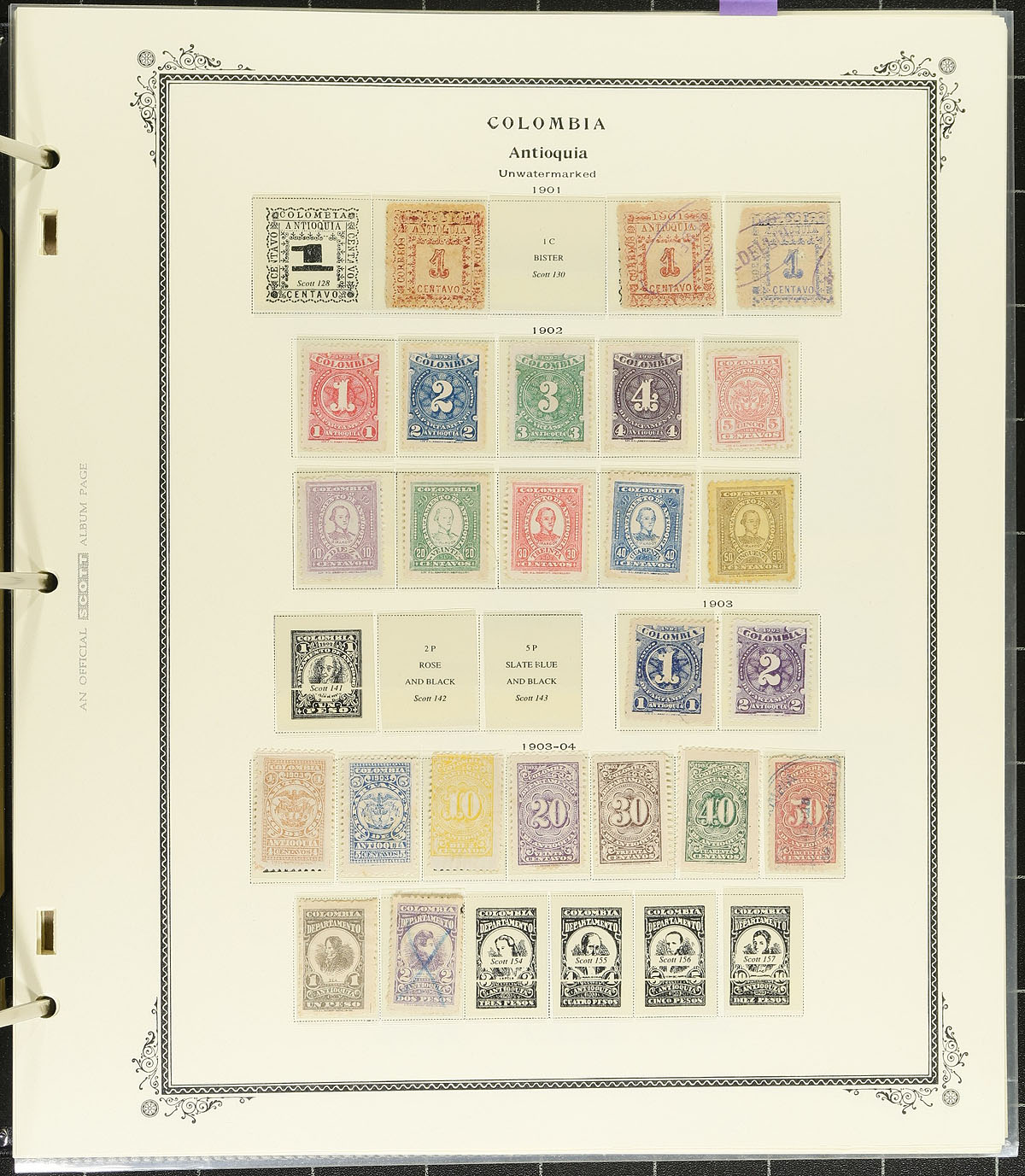 Nice collection of primarily mint Colombia, 1865-1977, containing roughly 1,225 stamps, well organized in several hingeless Scott Specialty album pages housed in a binder. The strength of the collection ranges from the 1880's up to the 1970's, and includes "back of the book" issues noting airmails, Colombia States, and more. A spot check indicated some stamps and sets ranging from $5 to $15 each. Owner's older Scott catalogue value for the collection totals US$1,331.00 ($1796.85 CDN). A nice collection that should be expanded, overall fine to very fine. Estimate =