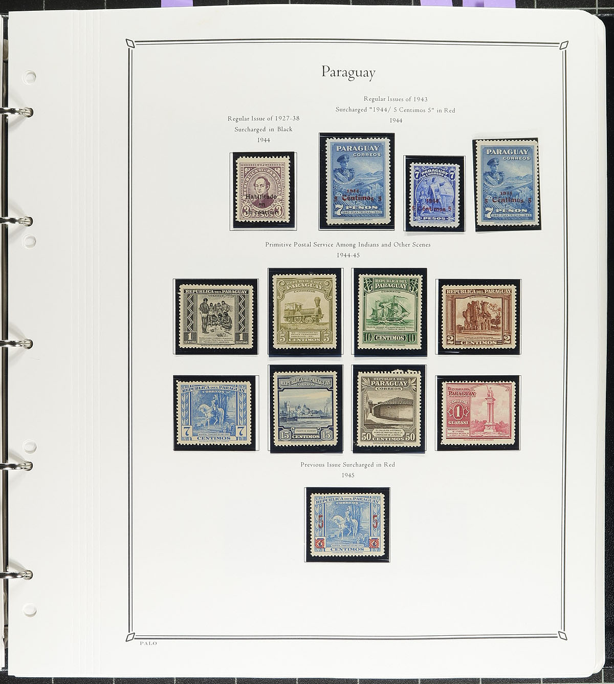 Clean collection of primarily mint Paraguay, 1880-1980, containing roughly 1,250 stamps, well organized in several hingeless Scott Specialty album pages housed in a binder. The collection generally ranges from Scott #10/622, along with back of the book issues including airmails, Interior Office issues, and pages with thematic/topical stamps. A spot check indicated some stamps and partial sets ranging $5 to $15 each. Owner's older Scott catalogue value for the collection totals US$2,630.00 ($3550.50 CDN). A nice collection that should be expanded, overall fine to very fine. Estimate =