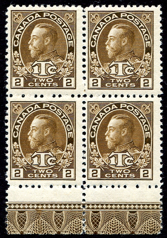 Fine Mint Never Hinged block of four of the 2c+1c brown, wet printing, George V Admiral War Tax issue, with full Type A lathework. Great colour, but with some perf separation on the top pair. 2024 Unitrade =