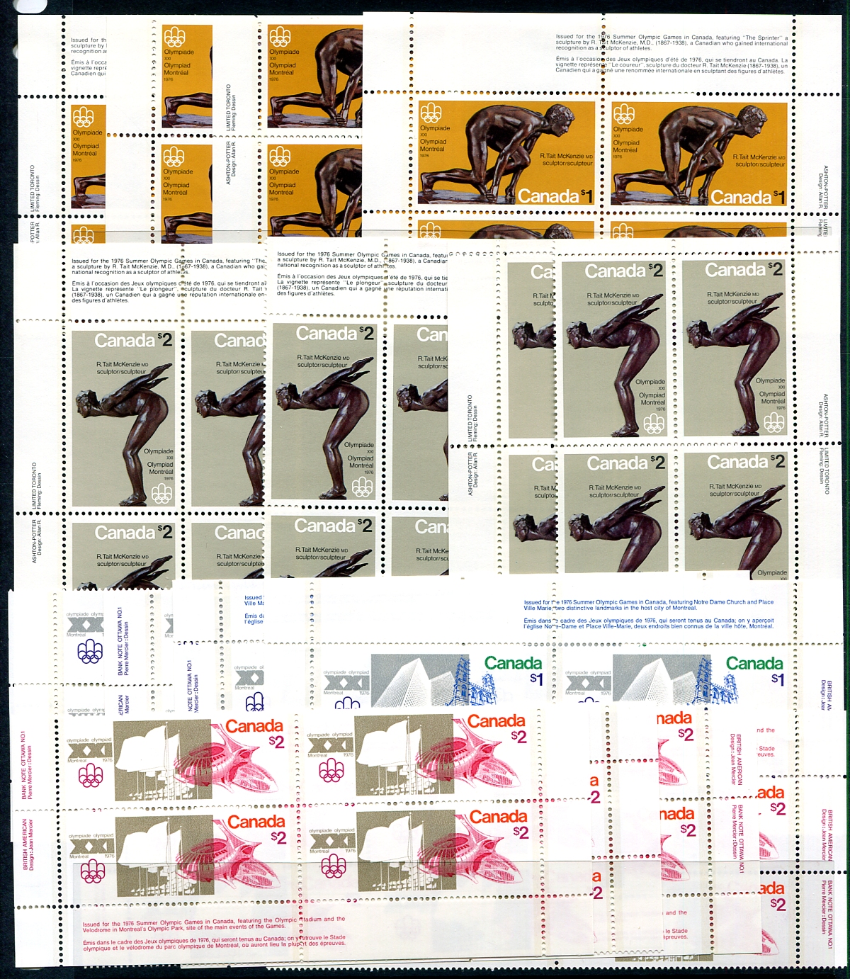 VF mint Never Hinged matched sets of plate blocks of the $1.00 and $2.00 1975 issue "Olympic Sculptures" and the $1.00 and $2.00 1976 issue "Olympic Sites". Getting harder to find with every passing year. (Total face value is $96.00). 2024 Unitrade =