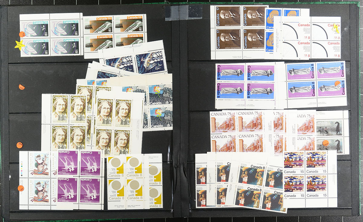 Green stockbook (14 x 4 row pages) with $292.00 face value, mostly plate blocks with various small Bileski pages of phosphor tagged stamps. Stockbook has seen better days, but plenty of "plus value" items throughout. Conservatively valued for the mint postage only. Total face value =