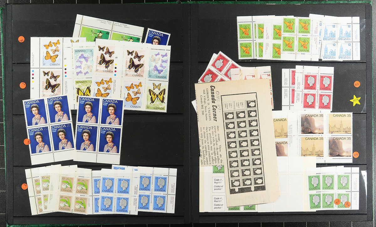 Green stockbook (14 x 4 row pages) with $292.00 face value, mostly plate blocks with various small Bileski pages of phosphor tagged stamps. Stockbook has seen better days, but plenty of "plus value" items throughout. Conservatively valued for the mint postage only. Total face value =