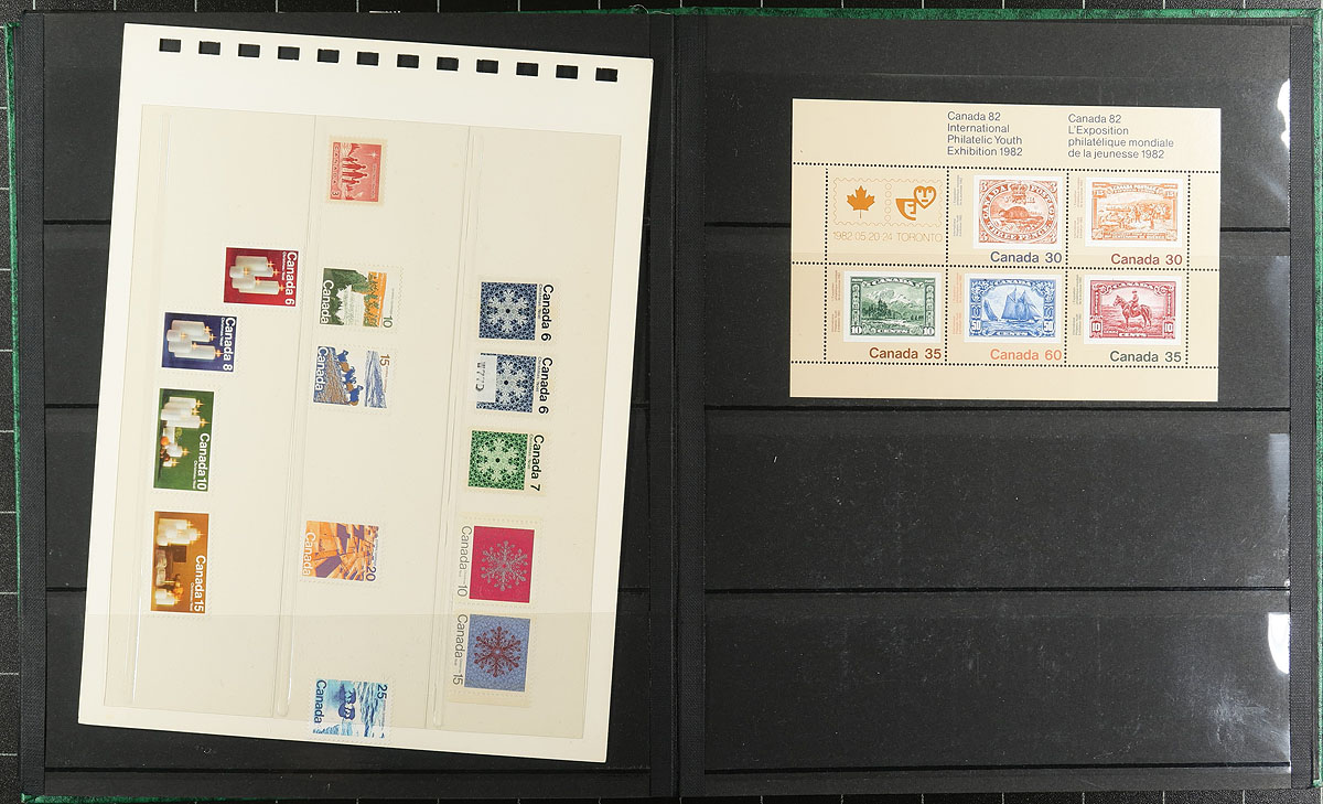 Green stockbook (14 x 4 row pages) with $292.00 face value, mostly plate blocks with various small Bileski pages of phosphor tagged stamps. Stockbook has seen better days, but plenty of "plus value" items throughout. Conservatively valued for the mint postage only. Total face value =