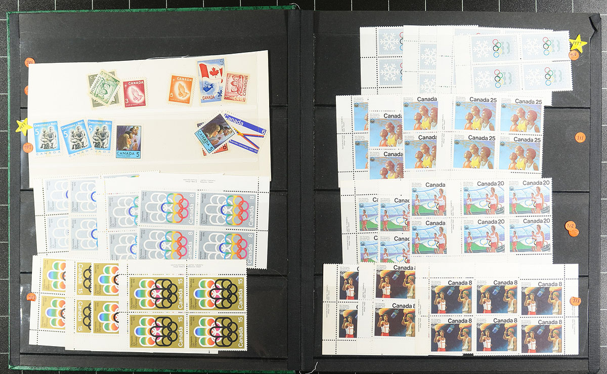 Green stockbook (14 x 4 row pages) with $292.00 face value, mostly plate blocks with various small Bileski pages of phosphor tagged stamps. Stockbook has seen better days, but plenty of "plus value" items throughout. Conservatively valued for the mint postage only. Total face value =