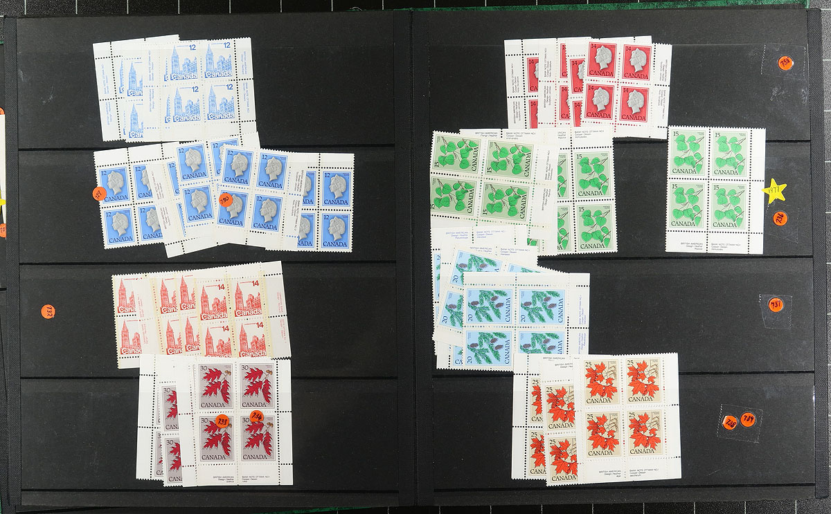 Green stockbook (14 x 4 row pages) with $292.00 face value, mostly plate blocks with various small Bileski pages of phosphor tagged stamps. Stockbook has seen better days, but plenty of "plus value" items throughout. Conservatively valued for the mint postage only. Total face value =