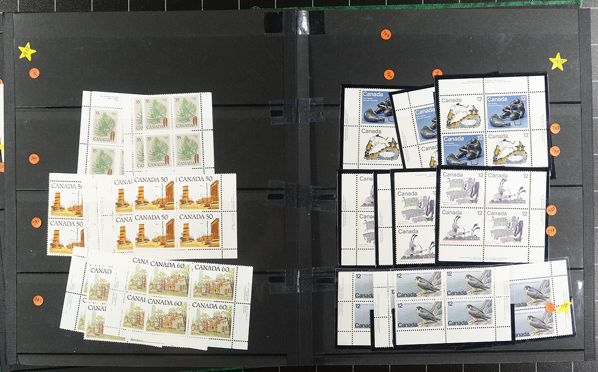 Green stockbook (14 x 4 row pages) with $292.00 face value, mostly plate blocks with various small Bileski pages of phosphor tagged stamps. Stockbook has seen better days, but plenty of "plus value" items throughout. Conservatively valued for the mint postage only. Total face value =