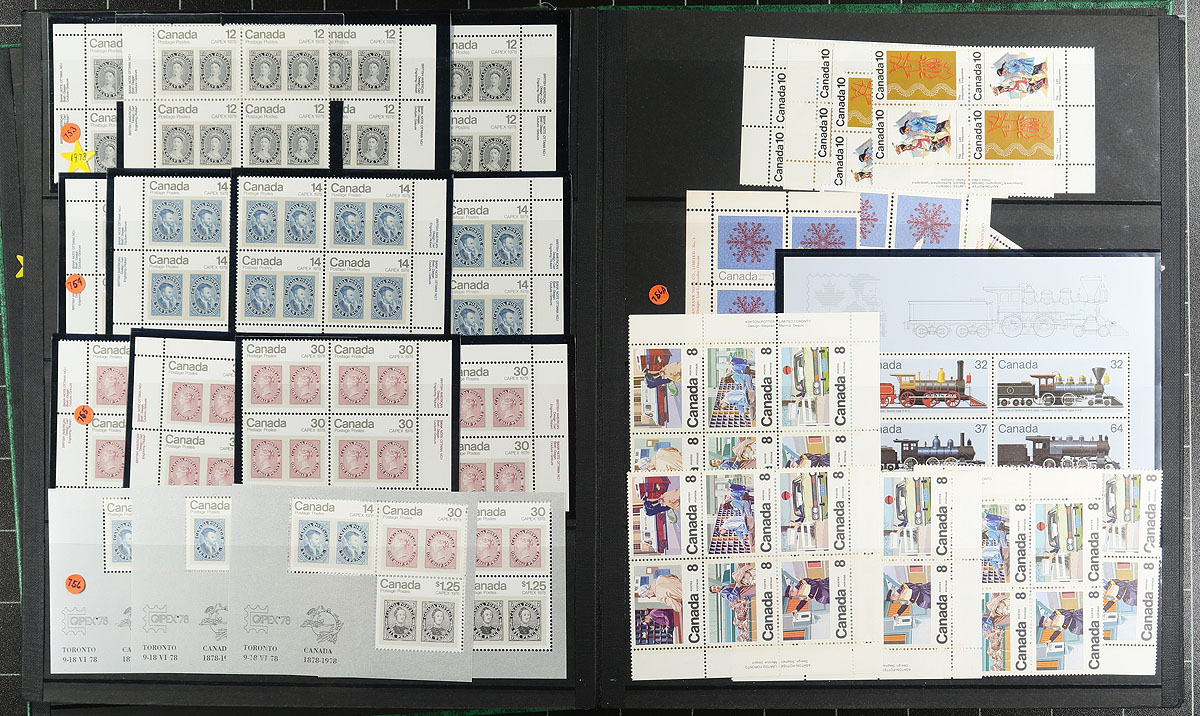 Green stockbook (14 x 4 row pages) with $292.00 face value, mostly plate blocks with various small Bileski pages of phosphor tagged stamps. Stockbook has seen better days, but plenty of "plus value" items throughout. Conservatively valued for the mint postage only. Total face value =