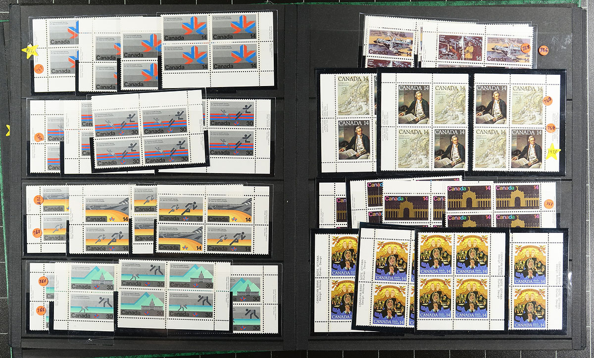Green stockbook (14 x 4 row pages) with $292.00 face value, mostly plate blocks with various small Bileski pages of phosphor tagged stamps. Stockbook has seen better days, but plenty of "plus value" items throughout. Conservatively valued for the mint postage only. Total face value =