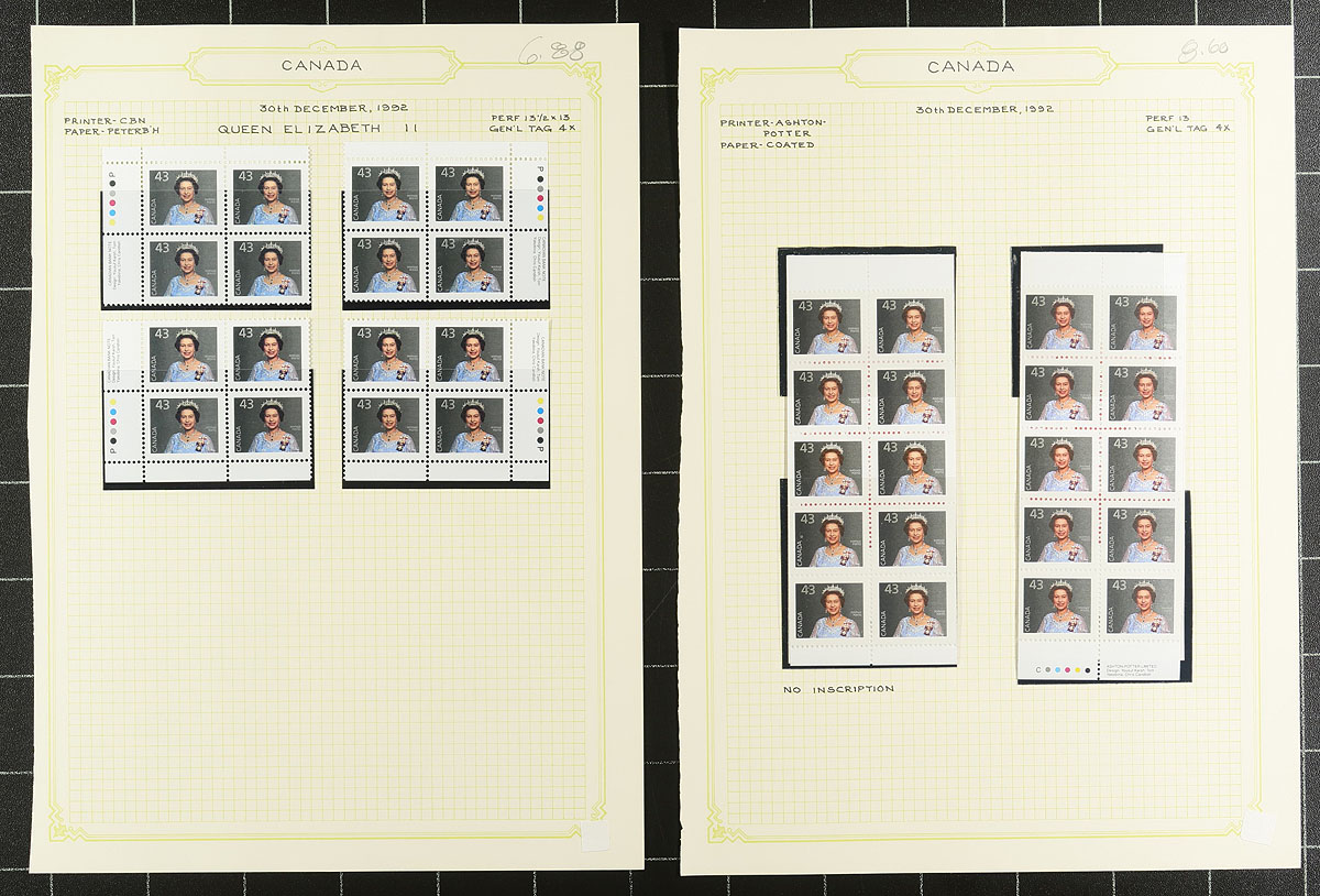 VF mint Never Hinged plate blocks / complete booklets collection in mounts, on pages of the 1990-2000 issued QEII portrait definitive issues. A very interesting area to collect, with changing printers and paper types. While there is usually not much change in catalogue value between the types, finding them is quite difficult. Face value alone is $104.20. 2024 Unitrade =
