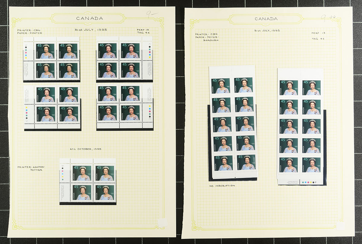 VF mint Never Hinged plate blocks / complete booklets collection in mounts, on pages of the 1990-2000 issued QEII portrait definitive issues. A very interesting area to collect, with changing printers and paper types. While there is usually not much change in catalogue value between the types, finding them is quite difficult. Face value alone is $104.20. 2024 Unitrade =