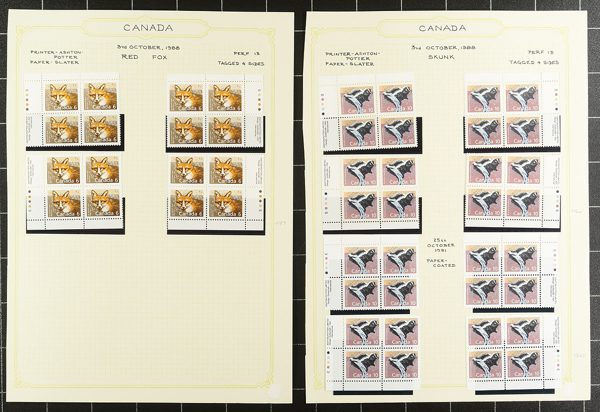 VF mint Never Hinged plate blocks / complete booklets in mounts, on pages of the 1988-1990 Wildlife low/mid-value definitives. One of the most popular collecting areas of the QEII period, with multiple printers / paper types to search for. This collection would make a solid "foot in the door" start to collecting this issue, with spaces left for some of the harder to acquire items. A total of 62 blocks / booklets. 2024 Unitrade =