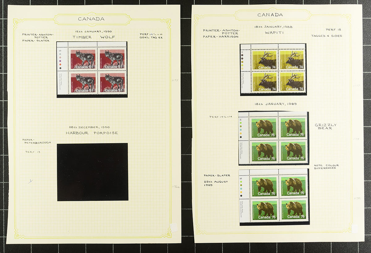 VF mint Never Hinged plate blocks / complete booklets in mounts, on pages of the 1988-1990 Wildlife low/mid-value definitives. One of the most popular collecting areas of the QEII period, with multiple printers / paper types to search for. This collection would make a solid "foot in the door" start to collecting this issue, with spaces left for some of the harder to acquire items. A total of 62 blocks / booklets. 2024 Unitrade =
