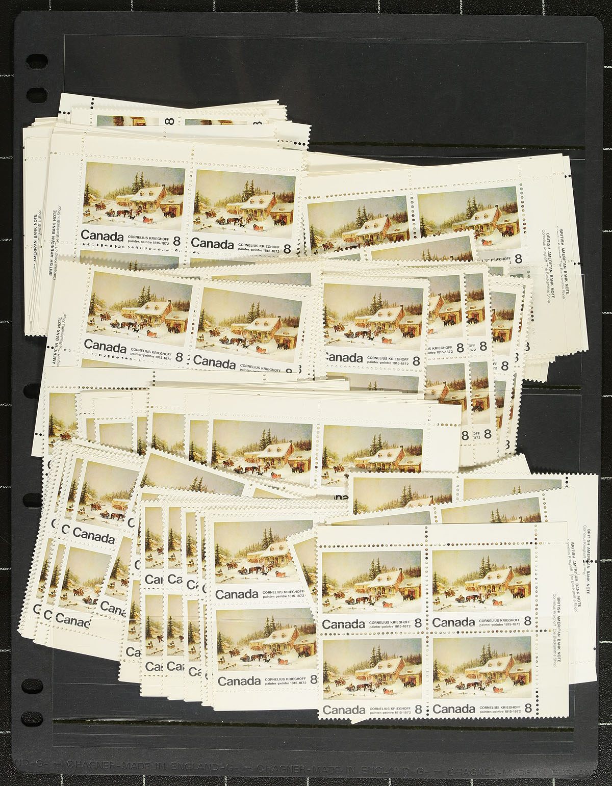 Wholesale lot of 39 VF MNH matched sets of plate blocks of the 1972 issue 8c Krieghoff, the right hand blocks all with the "broken doorframe" variety. We don't see large holdings like this too often these days. 2024 Unitrade =