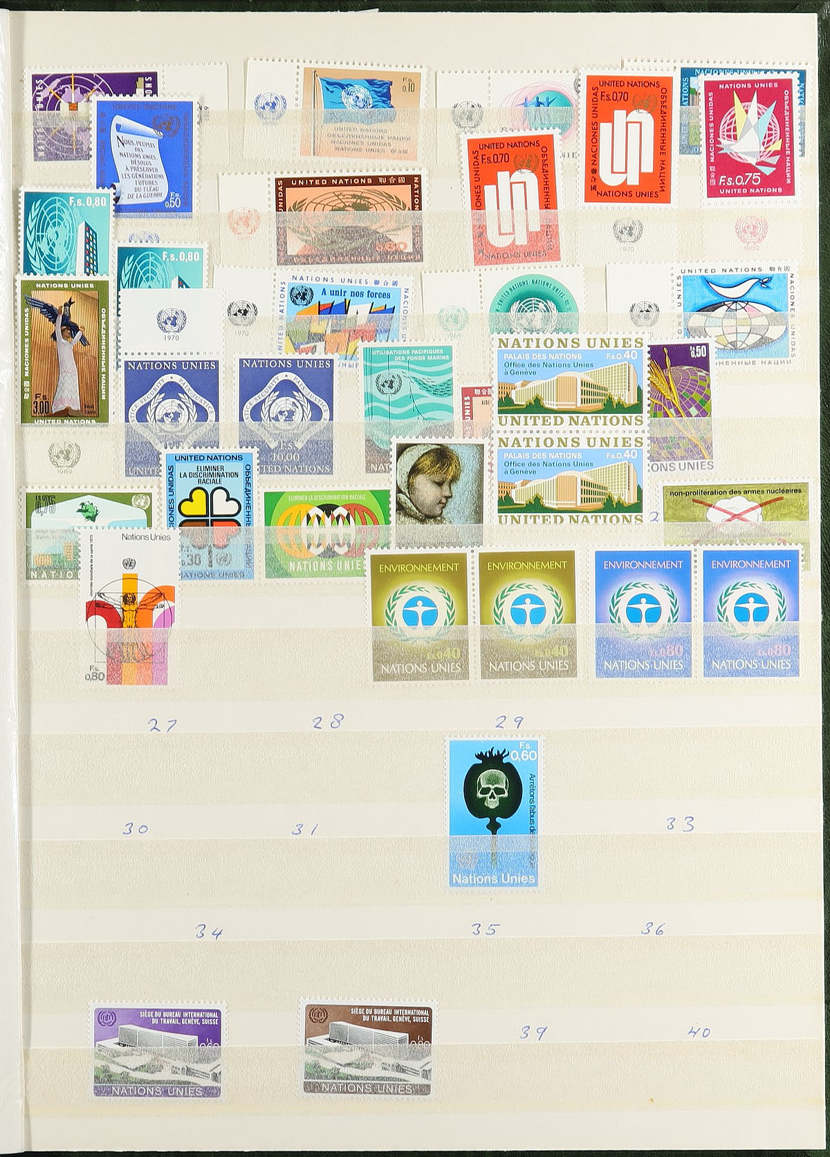Collection of mint never hinged United Nations, 1950's-2000's, containing many hundreds of stamps, notings singles and blocks, housed in 3 stockbooks. A cursory check indicated material from offices in New York, Austria, and Switzerland, which should be popular with topical and thematic collectors. A nice clean grouping. Estimate =