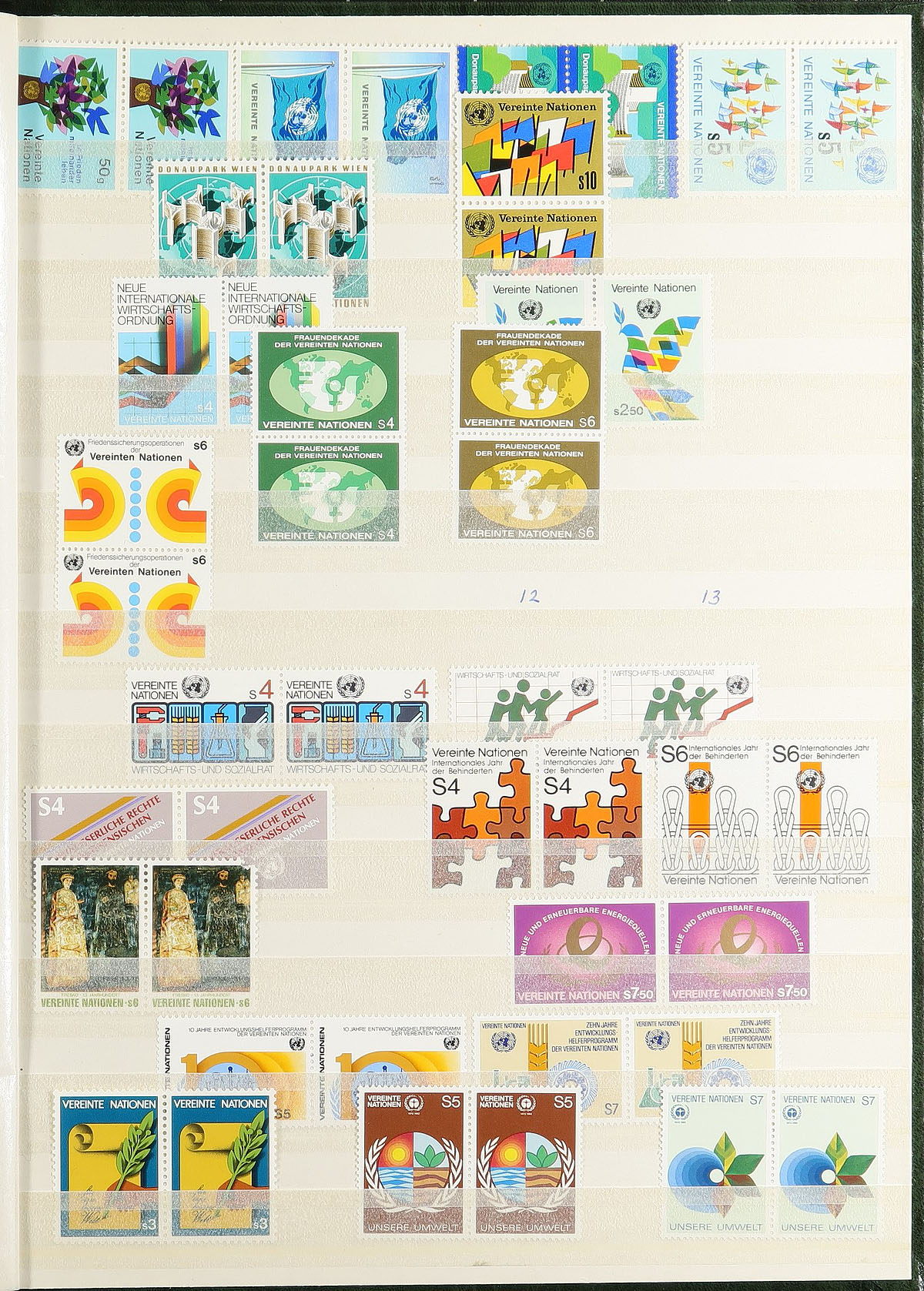 Collection of mint never hinged United Nations, 1950's-2000's, containing many hundreds of stamps, notings singles and blocks, housed in 3 stockbooks. A cursory check indicated material from offices in New York, Austria, and Switzerland, which should be popular with topical and thematic collectors. A nice clean grouping. Estimate =