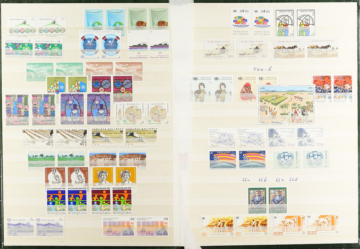 Collection of mint never hinged United Nations, 1950's-2000's, containing many hundreds of stamps, notings singles and blocks, housed in 3 stockbooks. A cursory check indicated material from offices in New York, Austria, and Switzerland, which should be popular with topical and thematic collectors. A nice clean grouping. Estimate =