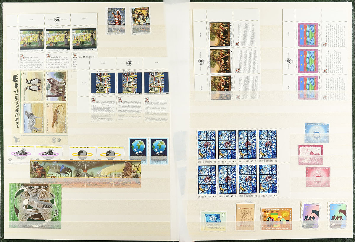 Collection of mint never hinged United Nations, 1950's-2000's, containing many hundreds of stamps, notings singles and blocks, housed in 3 stockbooks. A cursory check indicated material from offices in New York, Austria, and Switzerland, which should be popular with topical and thematic collectors. A nice clean grouping. Estimate =