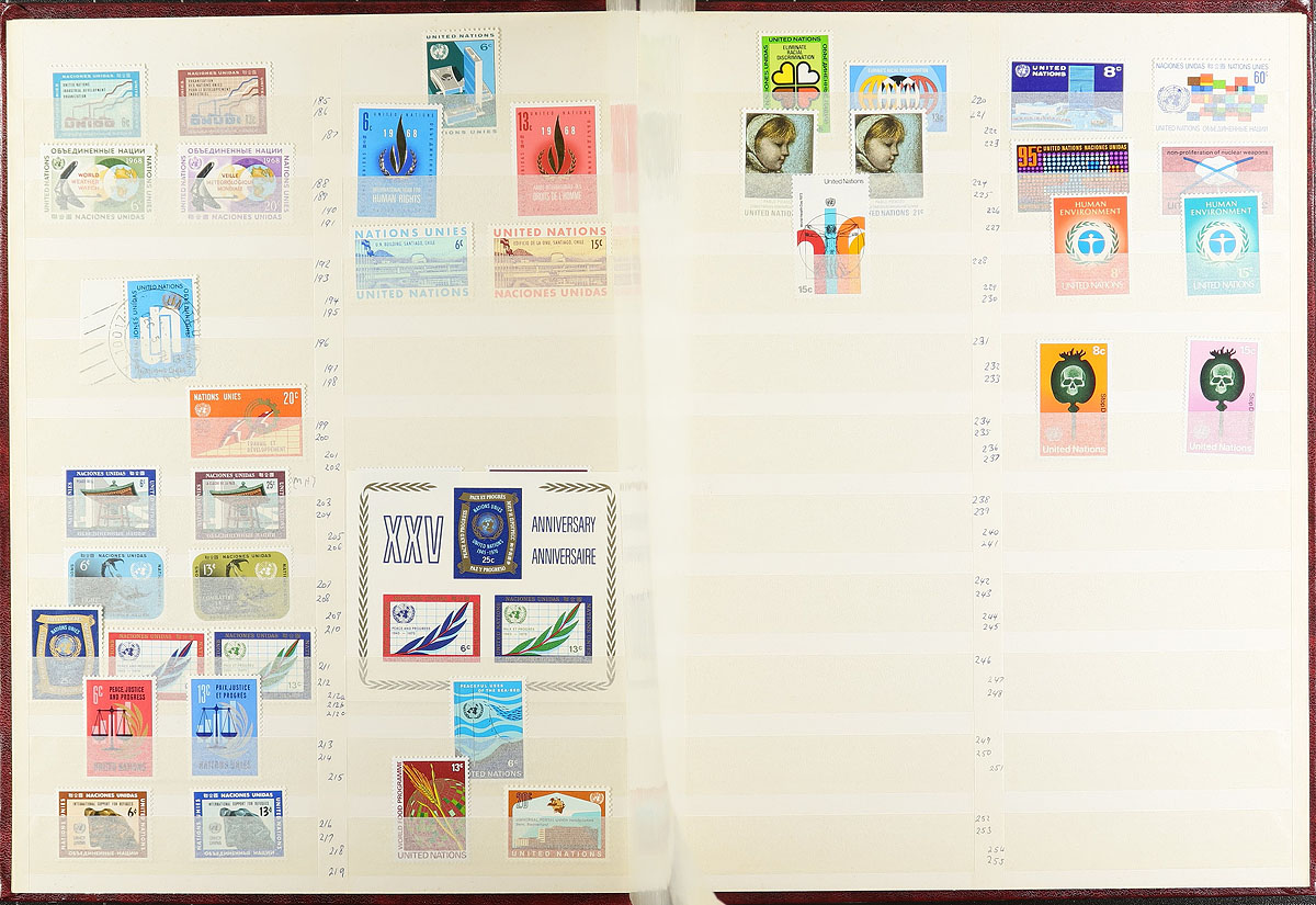 Collection of mint never hinged United Nations, 1950's-2000's, containing many hundreds of stamps, notings singles and blocks, housed in 3 stockbooks. A cursory check indicated material from offices in New York, Austria, and Switzerland, which should be popular with topical and thematic collectors. A nice clean grouping. Estimate =