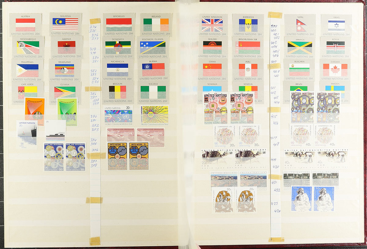 Collection of mint never hinged United Nations, 1950's-2000's, containing many hundreds of stamps, notings singles and blocks, housed in 3 stockbooks. A cursory check indicated material from offices in New York, Austria, and Switzerland, which should be popular with topical and thematic collectors. A nice clean grouping. Estimate =