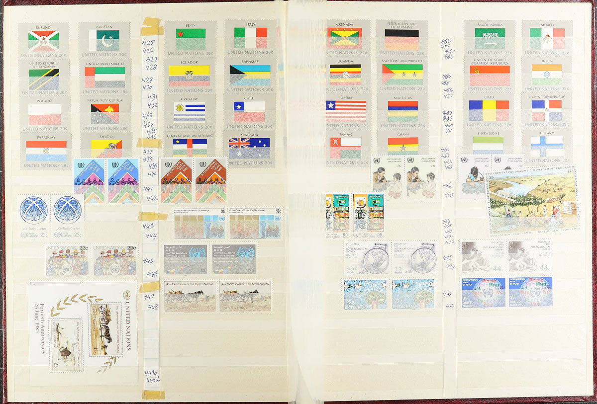 Collection of mint never hinged United Nations, 1950's-2000's, containing many hundreds of stamps, notings singles and blocks, housed in 3 stockbooks. A cursory check indicated material from offices in New York, Austria, and Switzerland, which should be popular with topical and thematic collectors. A nice clean grouping. Estimate =
