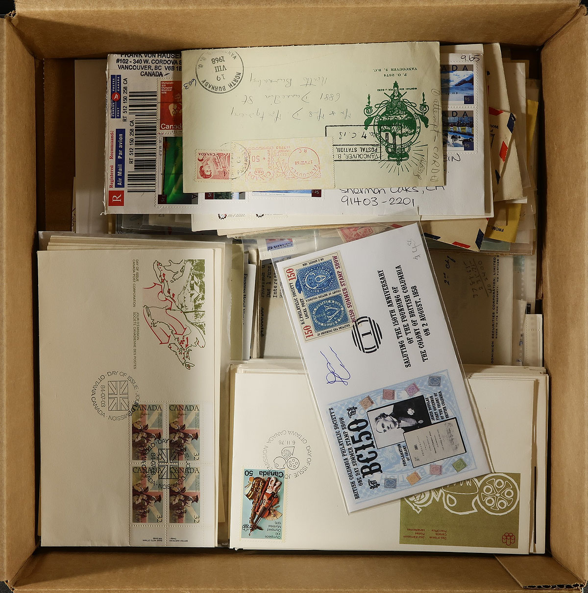 Accumulation of roughly 350 Canada covers in a box, noting a wide variety of items including a few Victorian covers, first day covers (including private cachets), postal stationery, first flight covers, postage dues, event and exhibition covers, commercial mail and more, noting a good variety of postmark types and rates. A little of everything to satisfy collectors and dollar boxes, as we note a few items priced in the $3 to $10 range. A few faults on a few covers, overall fine to very fine. Estimate =