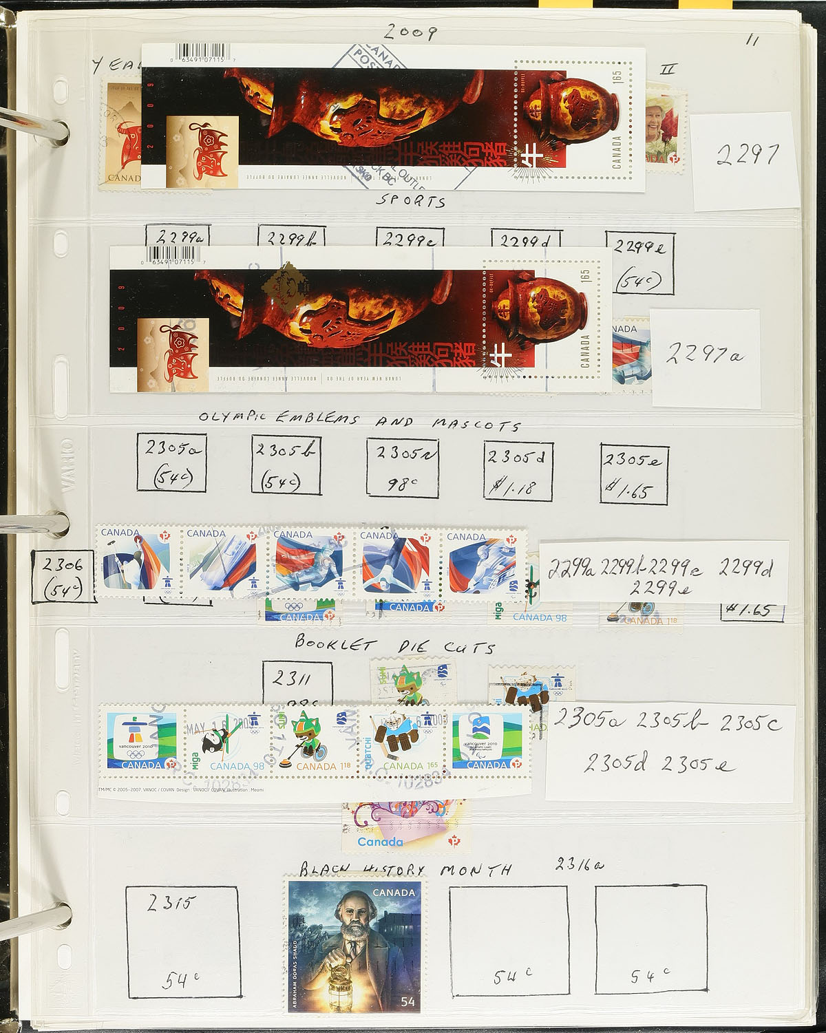 Modern collection / accumulation of used Canada, 2006-2014, containing roughly 500 stamps, along with a good selection of souvenir sheets, on many homemade and stock pages, housed in a binder. The group is fairly organized by year, with a spot check indicating mostly Christmas and definitive issues, along with souvenir sheet and commemorative issues, including $10 Whale singles (x4). A nice stater collection for the used collector, as modern used are getting harder and harder to find. Pictures show just a sampling. Estimate =