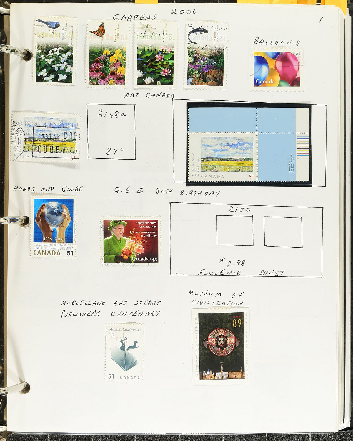 Modern collection / accumulation of used Canada, 2006-2014, containing roughly 500 stamps, along with a good selection of souvenir sheets, on many homemade and stock pages, housed in a binder. The group is fairly organized by year, with a spot check indicating mostly Christmas and definitive issues, along with souvenir sheet and commemorative issues, including $10 Whale singles (x4). A nice stater collection for the used collector, as modern used are getting harder and harder to find. Pictures show just a sampling. Estimate =
