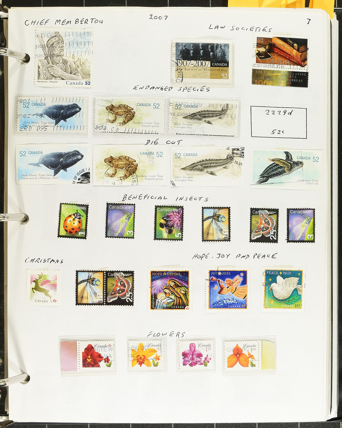 Modern collection / accumulation of used Canada, 2006-2014, containing roughly 500 stamps, along with a good selection of souvenir sheets, on many homemade and stock pages, housed in a binder. The group is fairly organized by year, with a spot check indicating mostly Christmas and definitive issues, along with souvenir sheet and commemorative issues, including $10 Whale singles (x4). A nice stater collection for the used collector, as modern used are getting harder and harder to find. Pictures show just a sampling. Estimate =