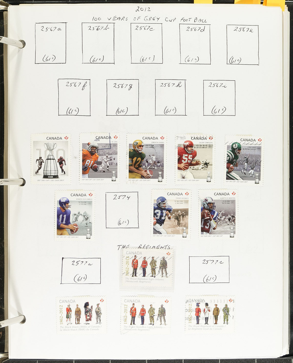 Modern collection / accumulation of used Canada, 2006-2014, containing roughly 500 stamps, along with a good selection of souvenir sheets, on many homemade and stock pages, housed in a binder. The group is fairly organized by year, with a spot check indicating mostly Christmas and definitive issues, along with souvenir sheet and commemorative issues, including $10 Whale singles (x4). A nice stater collection for the used collector, as modern used are getting harder and harder to find. Pictures show just a sampling. Estimate =