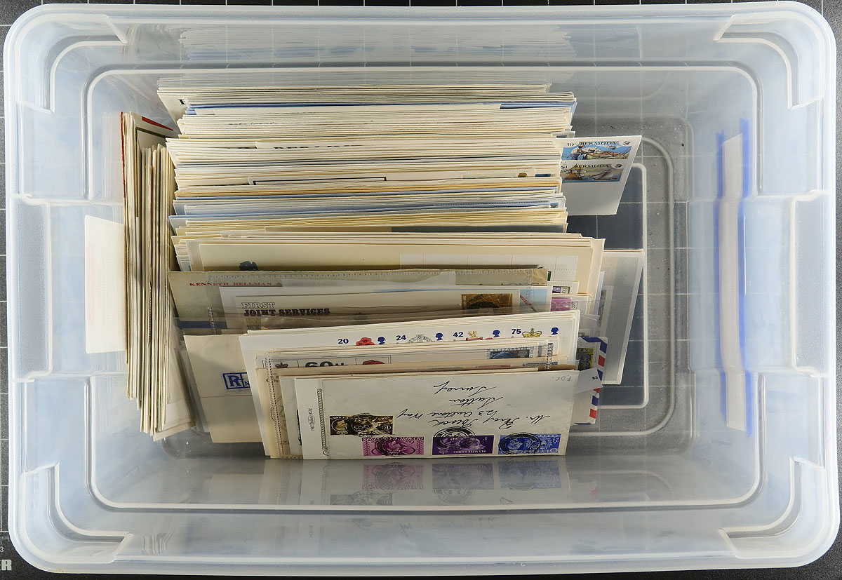 Group of roughly 200 British Commonwealth covers, 1940s-1980s, primarily first day covers, with better representation from Great Britain, New Zealand, Bermuda, and South Africa, noting single and sets frankings, and a handful of Great Britain covers signed by notable people. A nice group for the collector or dealer, as a few covers have been priced in the $5 to $10 range. Estimate =