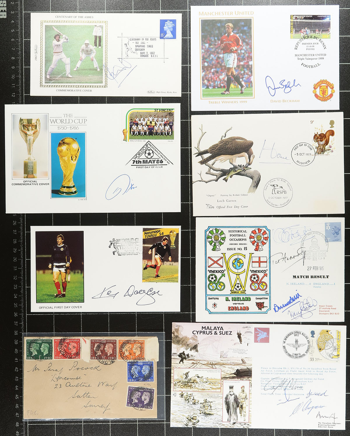 Group of roughly 200 British Commonwealth covers, 1940s-1980s, primarily first day covers, with better representation from Great Britain, New Zealand, Bermuda, and South Africa, noting single and sets frankings, and a handful of Great Britain covers signed by notable people. A nice group for the collector or dealer, as a few covers have been priced in the $5 to $10 range. Estimate =