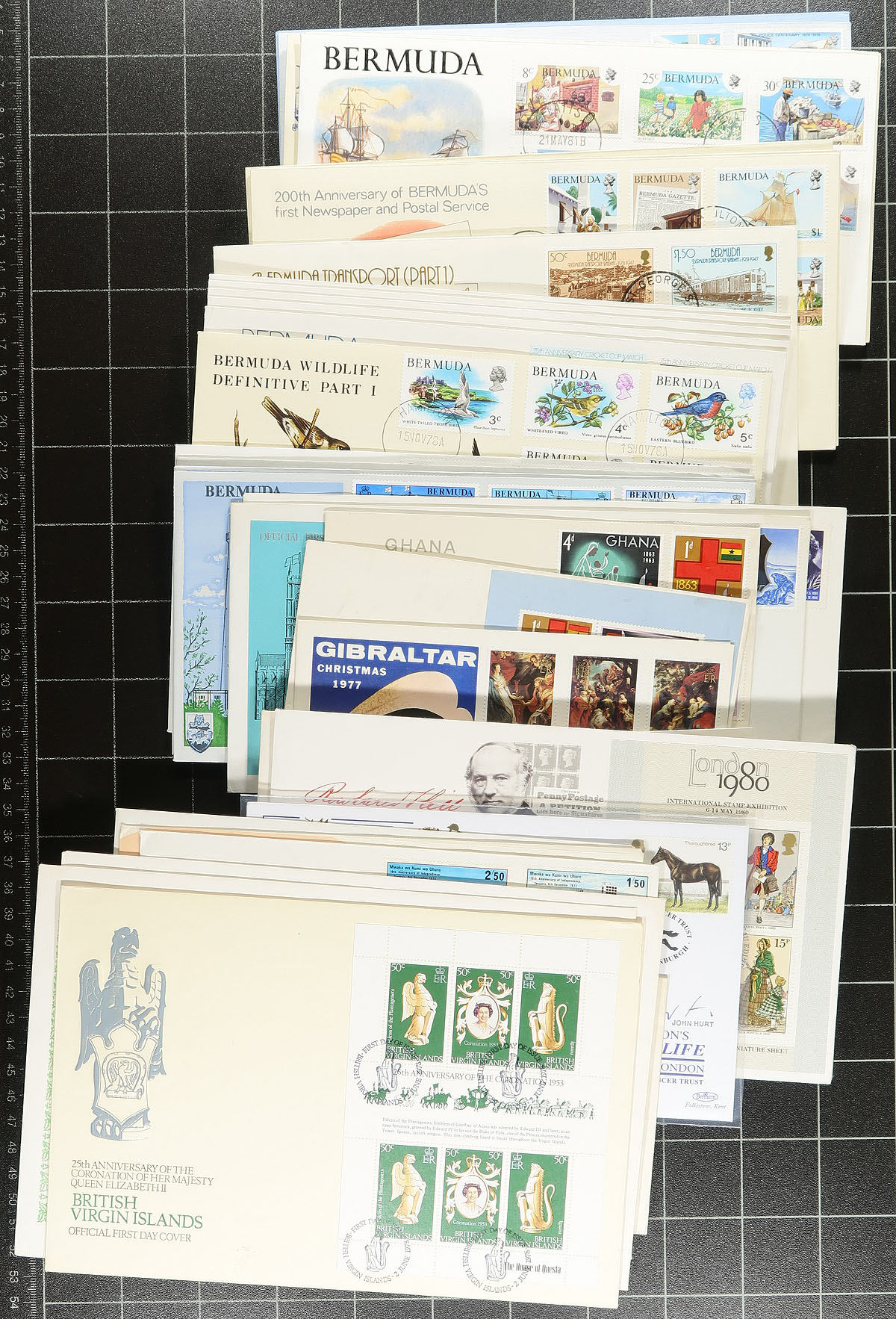 Group of roughly 200 British Commonwealth covers, 1940s-1980s, primarily first day covers, with better representation from Great Britain, New Zealand, Bermuda, and South Africa, noting single and sets frankings, and a handful of Great Britain covers signed by notable people. A nice group for the collector or dealer, as a few covers have been priced in the $5 to $10 range. Estimate =