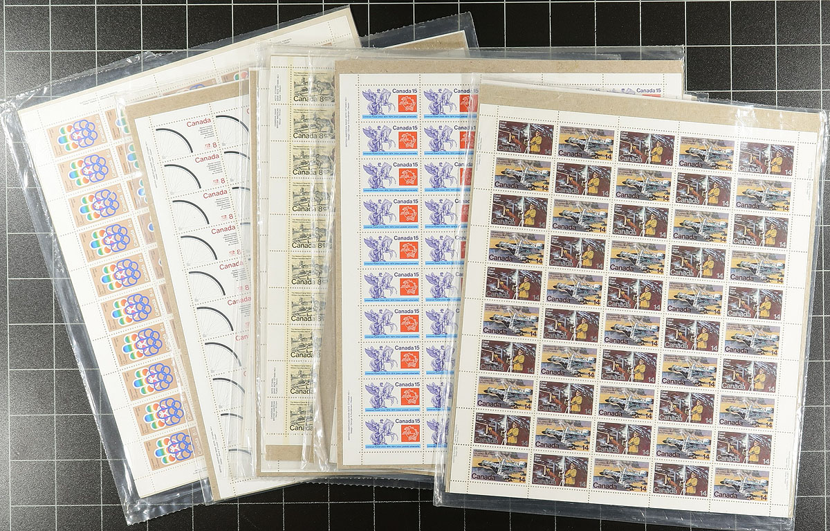 Mint Never Hinged Complete Sheets. Lovely group of 54 complete sheets, all from the 1970's (including a few semi-postals), with the vast majority still sealed in post office packaging. The majority of sheets range in the 8c to 15c denomination, and includes Unitrade #s 664-666 higher value Olympic issues. Face value for the lot totals $300. A clean lot for sheet collectors and postage users. Total face value =