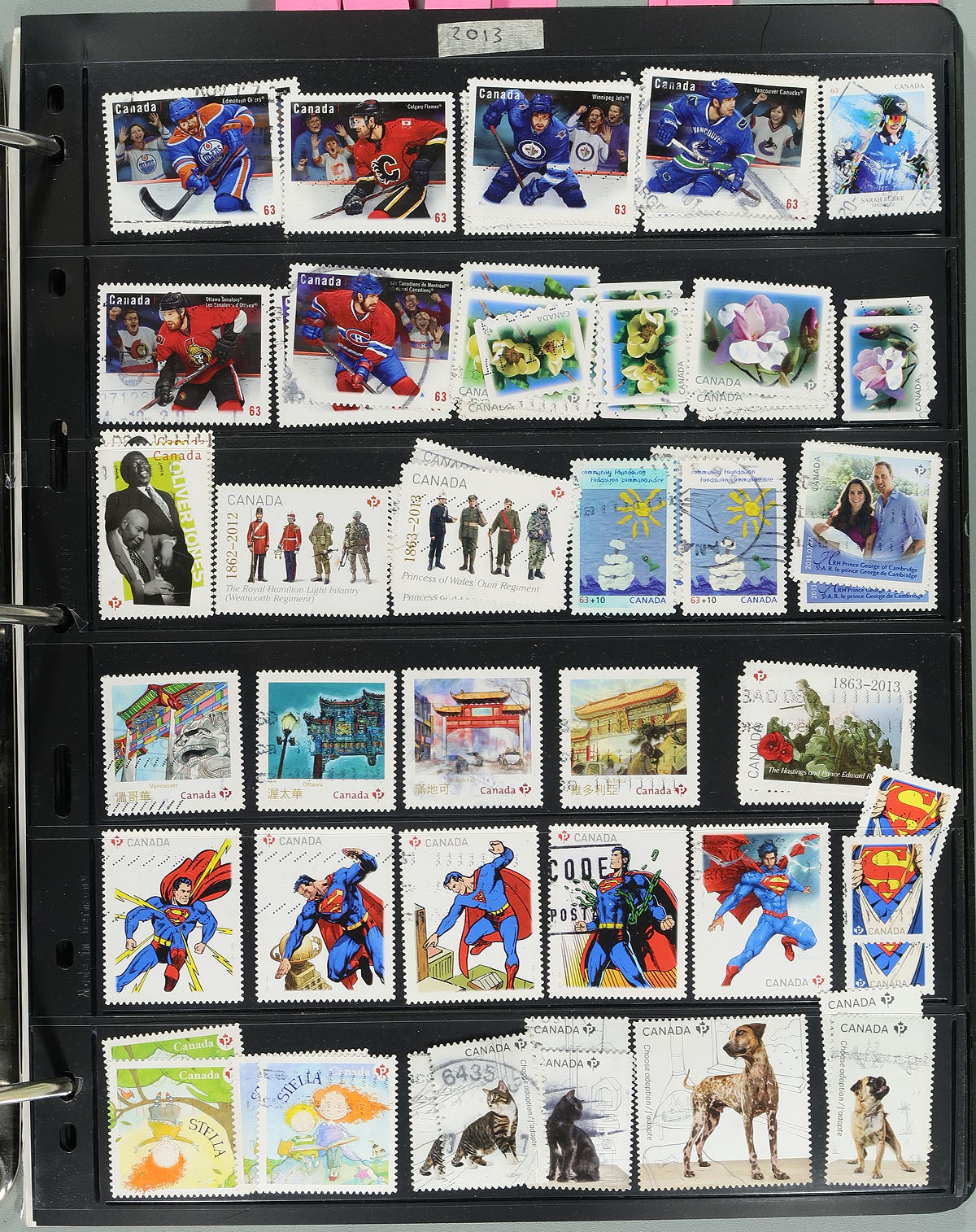 Large used collection of Canada 1859-2020, containing a few thousand stamps, neatly organized in roughly 55 double-sided Vario stock pages, housed in a thick binder. This collection has a little bit of everything including a few Small Queens, Jubilees, Leafs, Numerals, and continues with sets and partial sets of Edwards (full set), Quebecs (up to 7c), Admirals, Scrolls (up to 50c Bluenose), and complete sets of Arch, Pictorials, War and Peace issues. The collection continues with a good run of issues, including many modern used (8 double sided pages of post-2010 issues), along with a small selection of officials (perforated and overprinted), special delivery, revenues, and Newfoundland. A nice lot with duplication up to 10 for only a few issues. Online photos show a small sampling. Estimate =