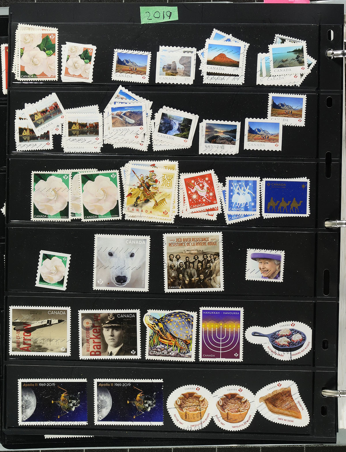 Large used collection of Canada 1859-2020, containing a few thousand stamps, neatly organized in roughly 55 double-sided Vario stock pages, housed in a thick binder. This collection has a little bit of everything including a few Small Queens, Jubilees, Leafs, Numerals, and continues with sets and partial sets of Edwards (full set), Quebecs (up to 7c), Admirals, Scrolls (up to 50c Bluenose), and complete sets of Arch, Pictorials, War and Peace issues. The collection continues with a good run of issues, including many modern used (8 double sided pages of post-2010 issues), along with a small selection of officials (perforated and overprinted), special delivery, revenues, and Newfoundland. A nice lot with duplication up to 10 for only a few issues. Online photos show a small sampling. Estimate =