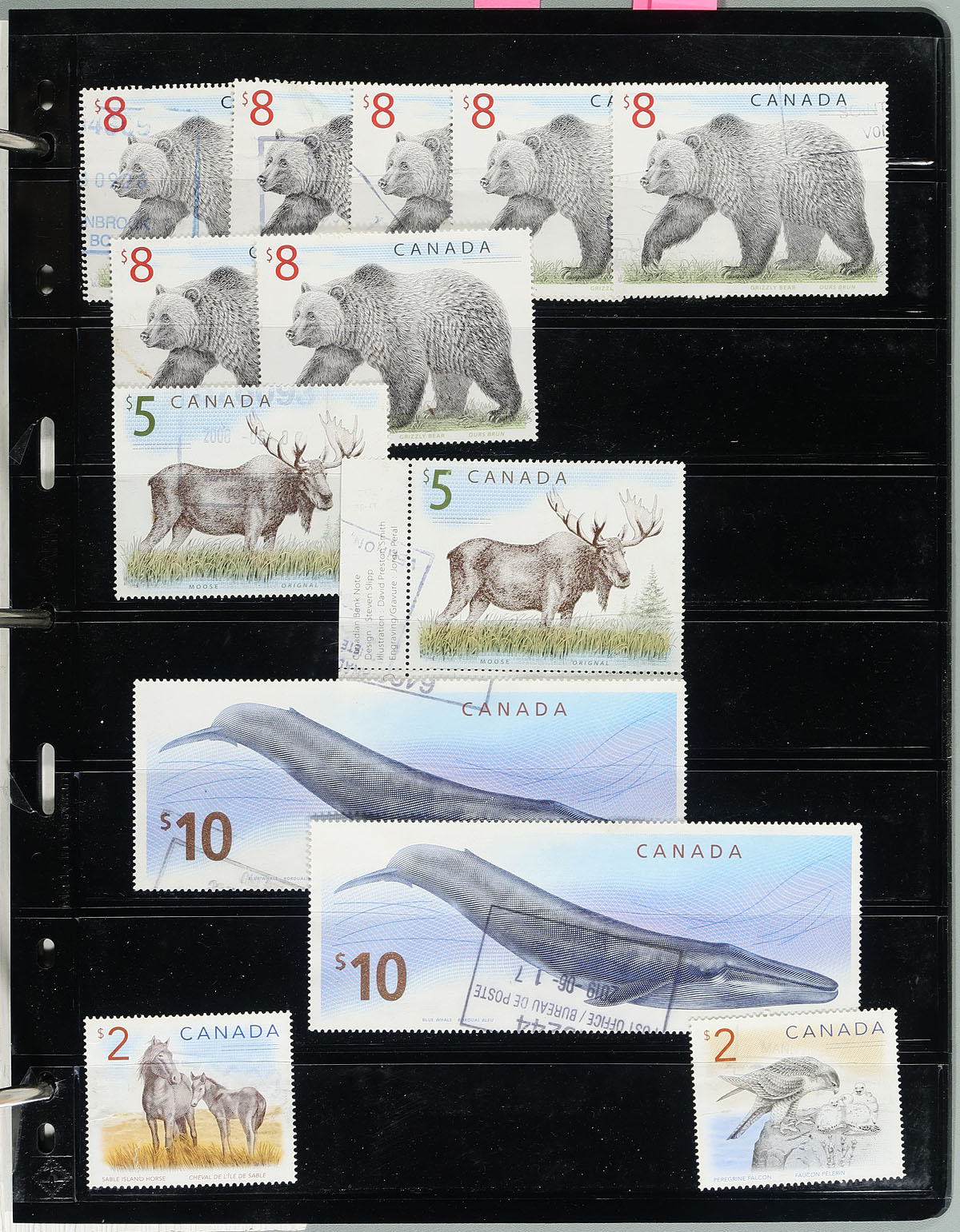 Large used collection of Canada 1859-2020, containing a few thousand stamps, neatly organized in roughly 55 double-sided Vario stock pages, housed in a thick binder. This collection has a little bit of everything including a few Small Queens, Jubilees, Leafs, Numerals, and continues with sets and partial sets of Edwards (full set), Quebecs (up to 7c), Admirals, Scrolls (up to 50c Bluenose), and complete sets of Arch, Pictorials, War and Peace issues. The collection continues with a good run of issues, including many modern used (8 double sided pages of post-2010 issues), along with a small selection of officials (perforated and overprinted), special delivery, revenues, and Newfoundland. A nice lot with duplication up to 10 for only a few issues. Online photos show a small sampling. Estimate =