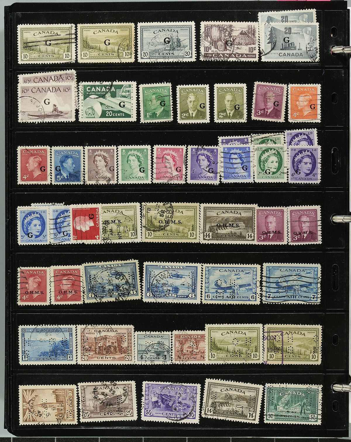 Large used collection of Canada 1859-2020, containing a few thousand stamps, neatly organized in roughly 55 double-sided Vario stock pages, housed in a thick binder. This collection has a little bit of everything including a few Small Queens, Jubilees, Leafs, Numerals, and continues with sets and partial sets of Edwards (full set), Quebecs (up to 7c), Admirals, Scrolls (up to 50c Bluenose), and complete sets of Arch, Pictorials, War and Peace issues. The collection continues with a good run of issues, including many modern used (8 double sided pages of post-2010 issues), along with a small selection of officials (perforated and overprinted), special delivery, revenues, and Newfoundland. A nice lot with duplication up to 10 for only a few issues. Online photos show a small sampling. Estimate =