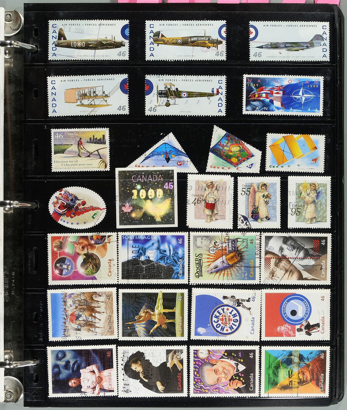 Large used collection of Canada 1859-2020, containing a few thousand stamps, neatly organized in roughly 55 double-sided Vario stock pages, housed in a thick binder. This collection has a little bit of everything including a few Small Queens, Jubilees, Leafs, Numerals, and continues with sets and partial sets of Edwards (full set), Quebecs (up to 7c), Admirals, Scrolls (up to 50c Bluenose), and complete sets of Arch, Pictorials, War and Peace issues. The collection continues with a good run of issues, including many modern used (8 double sided pages of post-2010 issues), along with a small selection of officials (perforated and overprinted), special delivery, revenues, and Newfoundland. A nice lot with duplication up to 10 for only a few issues. Online photos show a small sampling. Estimate =