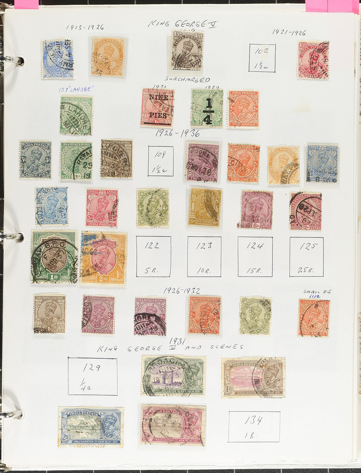 Collection of used India, 1854-1970's, containing many hundreds of stamps on well organized homemade pages housed in a binder. The collection begins with roughly 50 different Victorian issues including Scott #s 2, 4, 5 (c.v $165 total), 9-13, 17 ($150 total), and continues with singles and partial sets, with strength up to the 1950's. The lot also includes a selection of officials and a handful of India states. Postmark interest includes squared circles, cds and other town cancel types. A nice starter lot of this most interesting collecting area. Estimate =