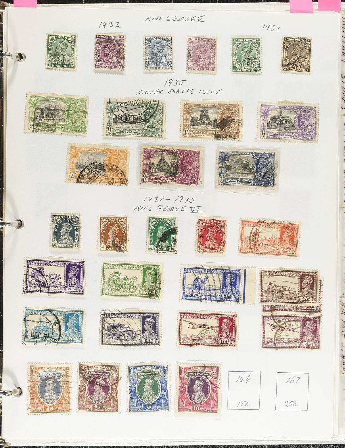 Collection of used India, 1854-1970's, containing many hundreds of stamps on well organized homemade pages housed in a binder. The collection begins with roughly 50 different Victorian issues including Scott #s 2, 4, 5 (c.v $165 total), 9-13, 17 ($150 total), and continues with singles and partial sets, with strength up to the 1950's. The lot also includes a selection of officials and a handful of India states. Postmark interest includes squared circles, cds and other town cancel types. A nice starter lot of this most interesting collecting area. Estimate =
