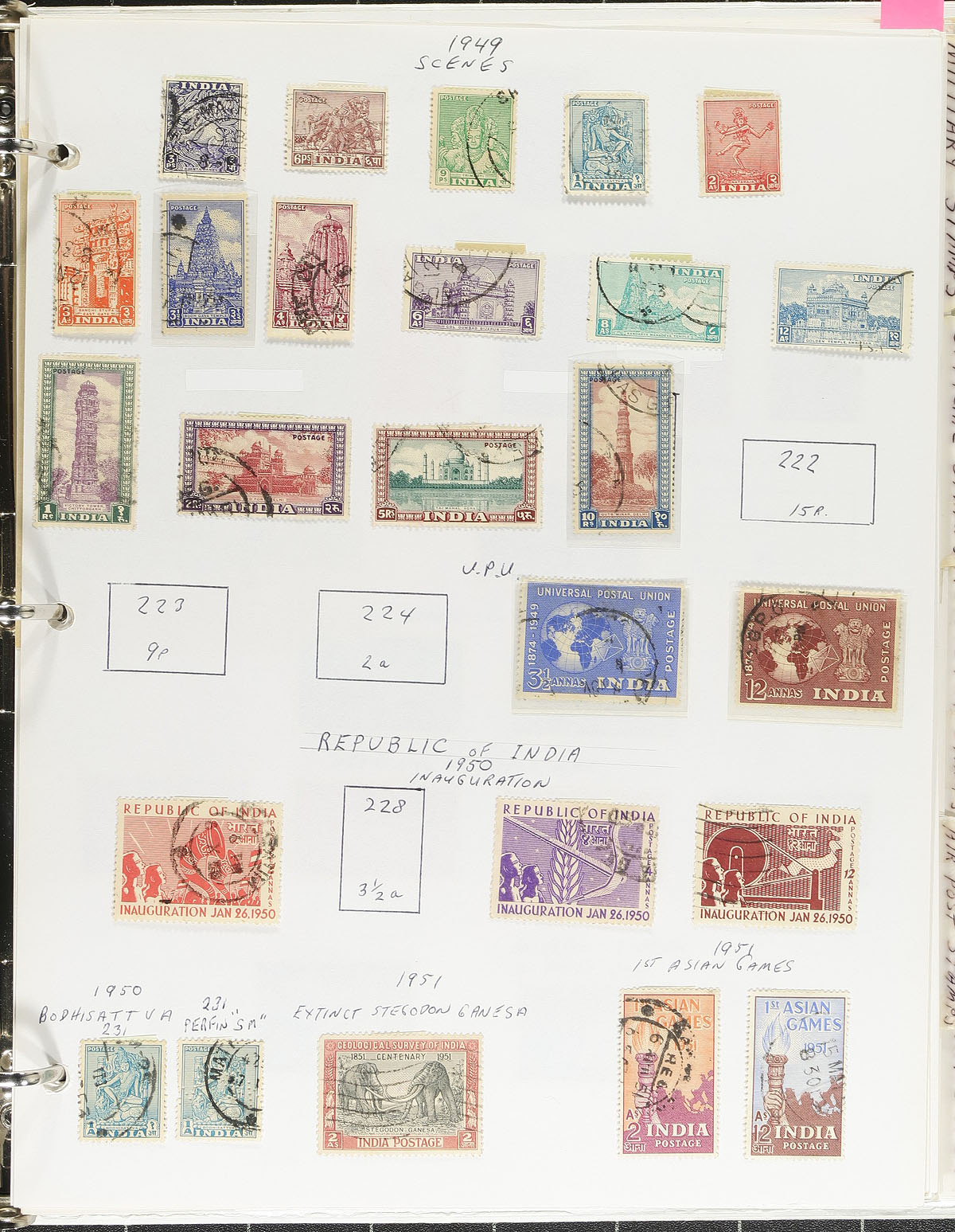 Collection of used India, 1854-1970's, containing many hundreds of stamps on well organized homemade pages housed in a binder. The collection begins with roughly 50 different Victorian issues including Scott #s 2, 4, 5 (c.v $165 total), 9-13, 17 ($150 total), and continues with singles and partial sets, with strength up to the 1950's. The lot also includes a selection of officials and a handful of India states. Postmark interest includes squared circles, cds and other town cancel types. A nice starter lot of this most interesting collecting area. Estimate =