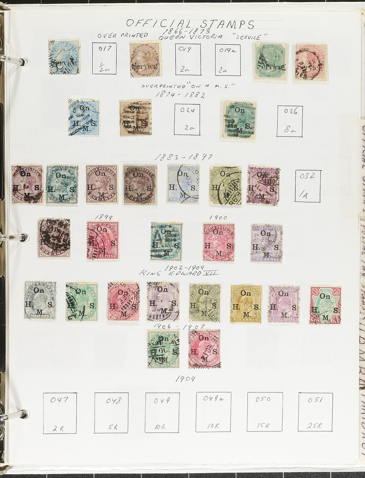 Collection of used India, 1854-1970's, containing many hundreds of stamps on well organized homemade pages housed in a binder. The collection begins with roughly 50 different Victorian issues including Scott #s 2, 4, 5 (c.v $165 total), 9-13, 17 ($150 total), and continues with singles and partial sets, with strength up to the 1950's. The lot also includes a selection of officials and a handful of India states. Postmark interest includes squared circles, cds and other town cancel types. A nice starter lot of this most interesting collecting area. Estimate =